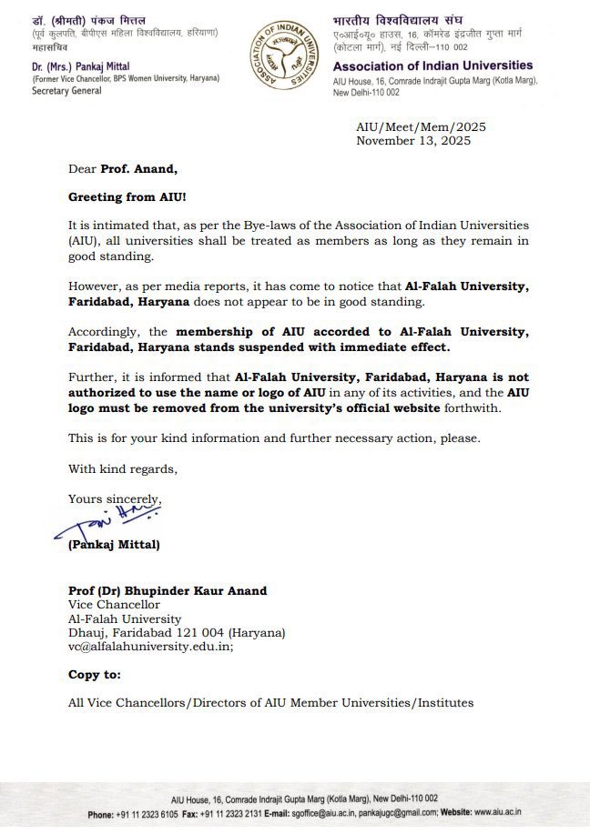 फरीदाबाद से विस्फोटक सामग्री और हथियारों सहित एक मेडिकल यूनिवर्सिटी से जुड़े डॉक्टरों के लाल क़िला कार धमाके के मामले में भारतीय विश्वविद्यालय संघ ने अल फलाह प्राइवेट विश्वविद्यालय की सदस्यता को निलंबित किया है और AIU महासचिव डॉ श्रीमती पी मित्तल ने वीसी को लिखित निर्देश दिया है कि विश्वविद्यालय AIU से संबद्धता होने का उल्लेख नहीं करेगा साथ ही AIU का लोगो का उपयोग भी प्रतिबंधित रहेगा।